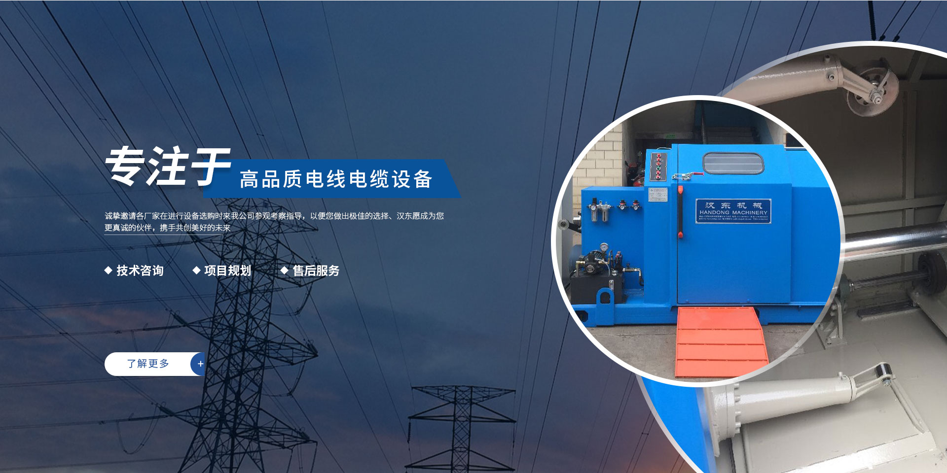 常州漢東機(jī)械始創(chuàng)于2006年,是集電線電纜機(jī)械設(shè)計(jì)、開發(fā)、制造、安裝、調(diào)試為一體化的高科技企業(yè)。本公司自開業(yè)以來(lái),積極引進(jìn)日本,歐美等國(guó)外電線電纜設(shè)備之先進(jìn)技術(shù),先后成功推出了達(dá)到行業(yè)先進(jìn)水平的電線電纜設(shè)備,主要產(chǎn)品有擠出、繞包、束線、成纜等電線電纜固定設(shè)備。在提供系統(tǒng)設(shè)備的同時(shí),還向客戶提供售前技術(shù)咨詢、項(xiàng)目規(guī)劃、以及售后服務(wù)。我公司本著“以人為本、科技先導(dǎo)、用戶為上”的宗旨,為客戶提供牢靠的產(chǎn)品與省心的服務(wù)。漢東愿成為您更真誠(chéng)的伙伴,攜手共創(chuàng)美好的未來(lái)!